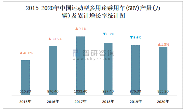 2015-2020年中國運動型多用途乘用車(SUV)產量及累計增長率統計圖