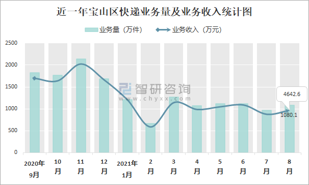 近一年寶山區(qū)快遞業(yè)務(wù)量及業(yè)務(wù)收入統(tǒng)計(jì)圖