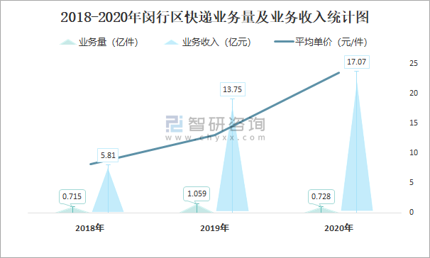 2018-2020年閔行區快遞業務量及業務收入統計圖