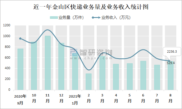 根據各省市郵政局數據可知:2021年8月金山區快遞業務量占上海快遞業務量的1.69%,上海快遞業務量占全國快遞業務量的3.48%;2021年8月金山區快遞業務收入占上海快遞業務收入的0.17%,上海快遞業務收入占全國快遞業務收入的16.01%。