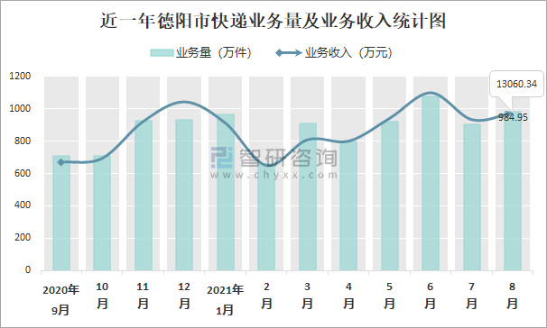 近一年德陽市快遞業務量及業務收入統計圖