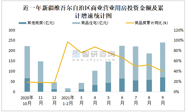 根據(jù)國(guó)家統(tǒng)計(jì)局?jǐn)?shù)據(jù)統(tǒng)計(jì)可知:2021年9月新疆維吾爾自治區(qū)房地產(chǎn)開(kāi)發(fā)投資商品房投資金額為240.25億元,其中包括辦公樓、商業(yè)營(yíng)業(yè)用房等其他用房69.38億元(注:辦公樓、商業(yè)營(yíng)業(yè)用房未分開(kāi)統(tǒng)計(jì));2021年1-9月新疆維吾爾自治區(qū)房地產(chǎn)開(kāi)發(fā)投資包括商業(yè)營(yíng)業(yè)用房在內(nèi)的其他用房累計(jì)金額為340.76億元。
