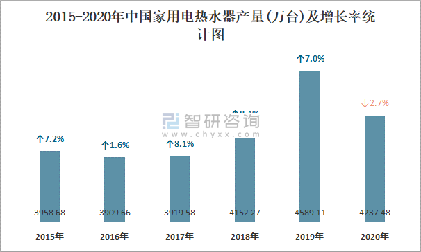 2015-2020年中國家用電熱水器產(chǎn)量及增長率統(tǒng)計圖