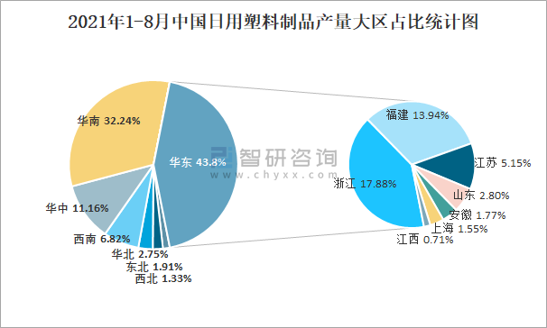 2021年1-8月中國日用塑料制品產(chǎn)量大區(qū)占比統(tǒng)計(jì)圖