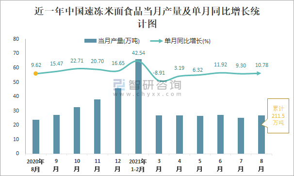 根據國家統計局數據顯示:2021年8月中國速凍米面食品產量為26.8萬噸,同比增長10.78%;2021年1-8月中國速凍米面食品累計產量為211.5萬噸,同比增長11.25%;2015-2020年中國速凍米面食品產量2019年跌至最低,次年小幅度回升。