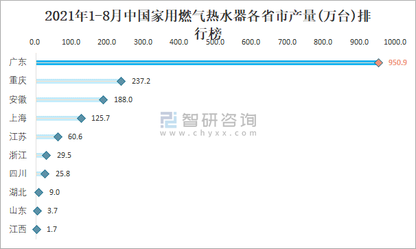 2021年1-8月中國家用燃氣熱水器各省市產量排行榜
