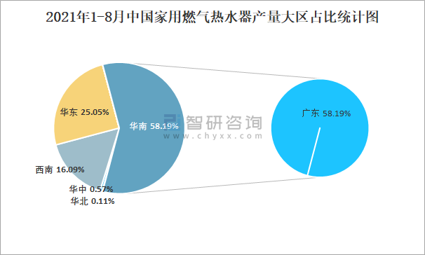 2021年1-8月中國家用燃氣熱水器產量大區占比統計圖