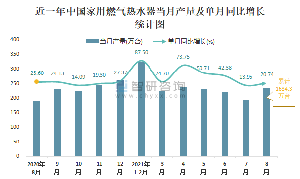 根據國家統計局數據顯示:2021年8月中國家用燃氣熱水器產量為235萬臺,同比增長20.74%;2021年1-8月中國家用燃氣熱水器累計產量為1634.3萬臺,同比增長43.36%;2015-2020年中國家用燃氣熱水器產量總體呈現上升趨勢,2020年達到最高。