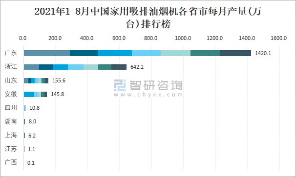 2021年1-8月中國家用吸排油煙機(jī)各省市每月產(chǎn)量排行榜