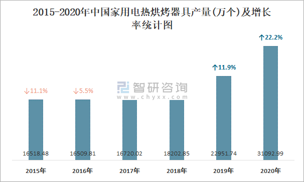 2015-2020年中國家用電熱烘烤器產量及增長率統計圖