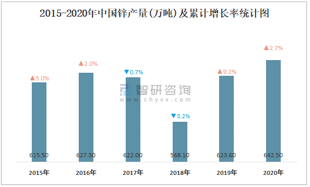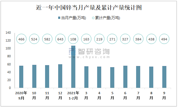 根據(jù)國(guó)家統(tǒng)計(jì)局?jǐn)?shù)據(jù)顯示:2021年9月中國(guó)鋅產(chǎn)量為55.6萬噸,同比下降2.5%;2021年1-9月中國(guó)鋅累計(jì)產(chǎn)量為493.7萬噸,累計(jì)增長(zhǎng)4.9%;2015-2020年中國(guó)鋅產(chǎn)量波動(dòng)較大,2018年跌至最低,此后逐年遞減。