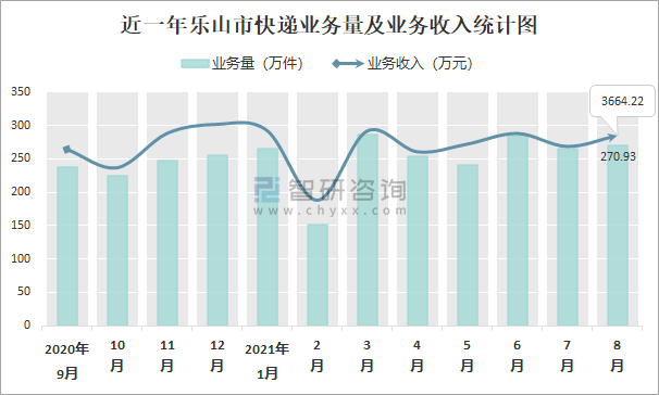 近一年樂山市快遞業務量及業務收入統計圖