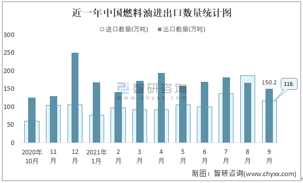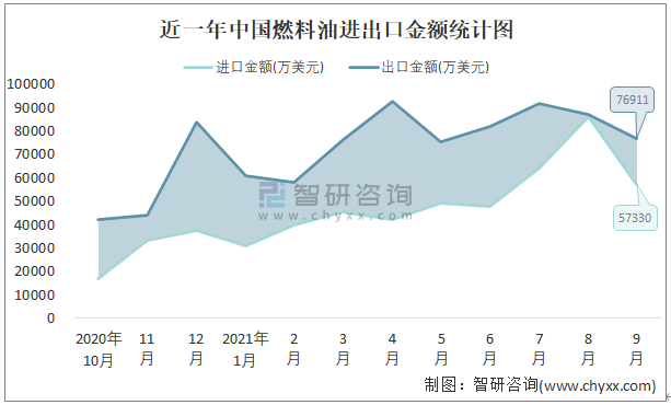 根據中國石油和化學工業聯合會數據顯示:2021年9月中國燃料油進口數量為116.7萬噸,出口數量為150.2萬噸;進口金額為57330萬美元,出口金額為76911萬美元;近一年中國燃料油出口總金額大于進口總金額,貿易順差為主,出口均價512美元/噸。