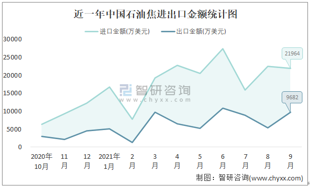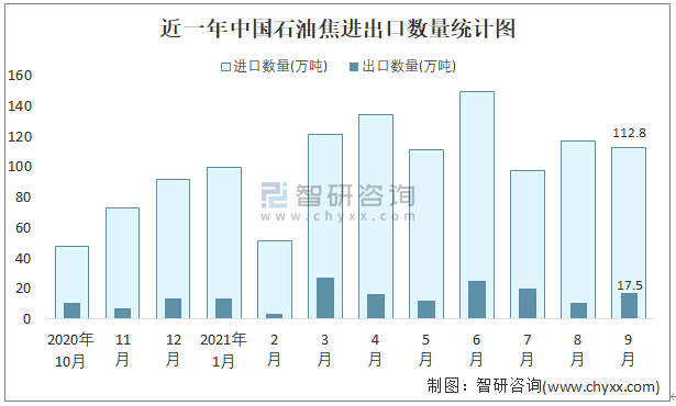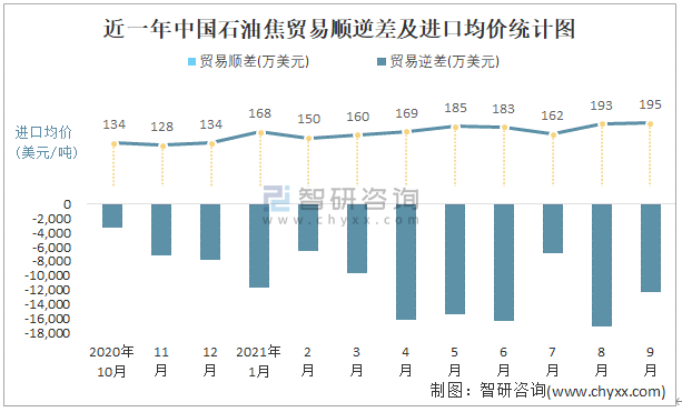 根據中國石油和化學工業聯合會數據顯示:2021年9月中國石油焦進口數量為112.8萬噸,出口數量為17.5萬噸;進口金額為21964萬美元,出口金額為9682萬美元;近一年中國石油焦出口總金額小于進口總金額,貿易逆差為主,進口均價195美元/噸。
