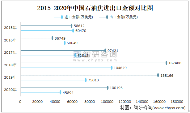 根據中國石油和化學工業聯合會數據顯示:2015-2020年中國石油焦進口數量總體呈上升趨勢,進口金額在2018年達到最大值;出口數量在2016年達到最大值,出口金額在2018年達到最大值。
