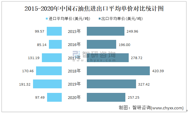 2015-2020年中國石油焦進出口平均單價對比統計圖