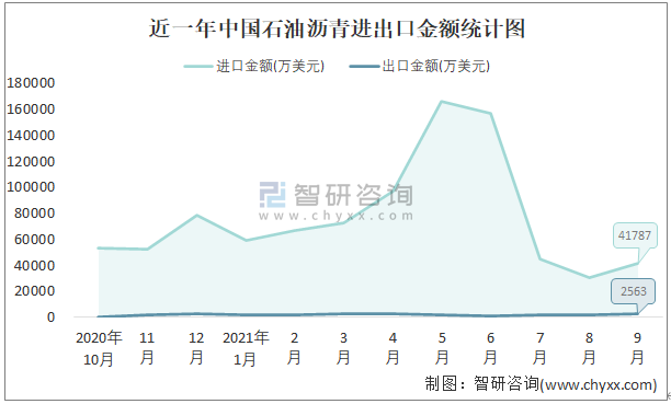 根據中國石油和化學工業聯合會數據顯示:2021年9月中國石油瀝青進口數量為108.7萬噸,出口數量為4.9萬噸;進口金額為41787萬美元,出口金額為2563萬美元;近一年中國石油瀝青出口總金額小于進口總金額,貿易逆差為主,進口均價384美元/噸。