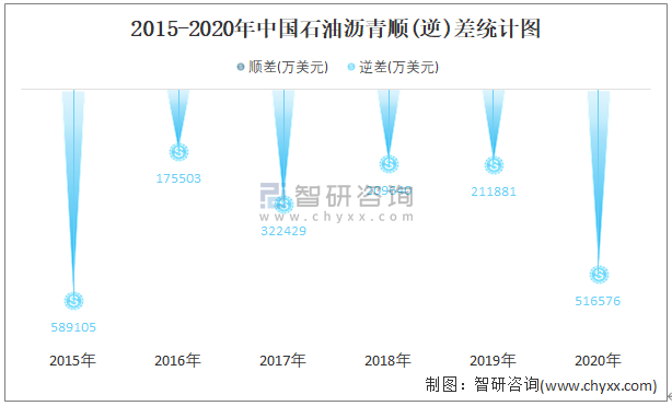 2015-2020年中國石油瀝青進出口金額對比統計圖