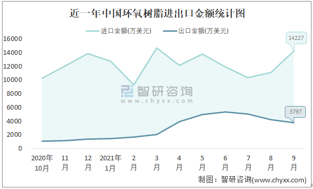 根據中國石油和化學工業聯合會數據顯示:2021年9月中國環氧樹脂進口數量為3萬噸,出口數量為0.9萬噸;進口金額為14227萬美元,出口金額為3797萬美元;近一年中國環氧樹脂出口總金額小于進口總金額,貿易逆差為主,進口均價4742美元/噸。