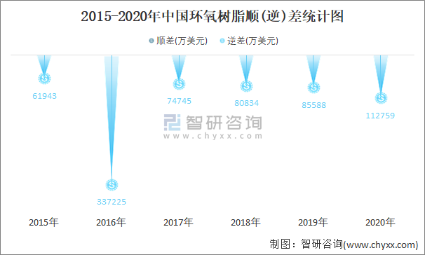 2015-2020年中國環氧樹脂順(逆)差統計圖