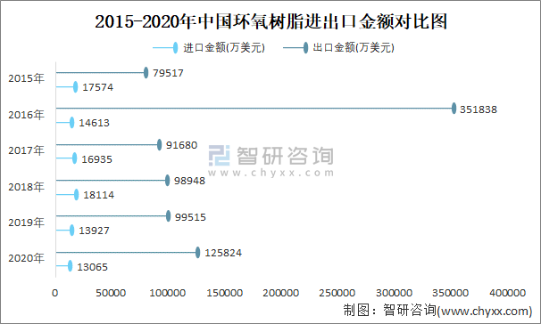 2015-2020年中國環氧樹脂進出口金額對比統計圖