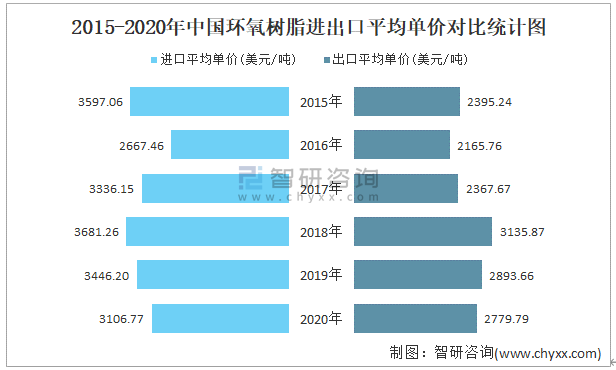 2015-2020年中國環氧樹脂進出口平均單價對比統計圖