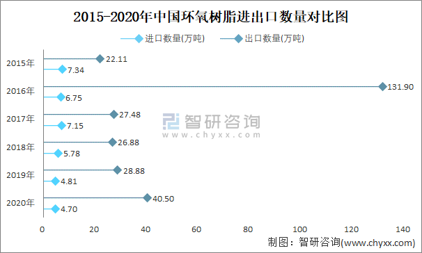 2015-2020年中國環氧樹脂進出口數量對比統計圖