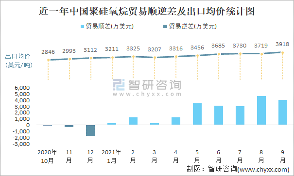 近一年中國(guó)聚硅氧烷順逆差及出口均價(jià)統(tǒng)計(jì)圖