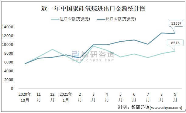 根據(jù)中國(guó)石油和化學(xué)工業(yè)聯(lián)合會(huì)數(shù)據(jù)顯示:2021年9月中國(guó)聚硅氧烷進(jìn)口數(shù)量為1.2萬(wàn)噸,出口數(shù)量為3.2萬(wàn)噸;進(jìn)口金額為8516萬(wàn)美元,出口金額為12537萬(wàn)美元;近一年中國(guó)聚硅氧烷出口總金額大于進(jìn)口總金額,貿(mào)易順差為主,出口均價(jià)3918美元/噸。