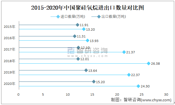 2015-2020年中國(guó)聚硅氧烷進(jìn)出口數(shù)量對(duì)比統(tǒng)計(jì)圖