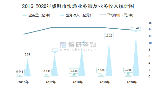 2016-2020年威海市快遞業(yè)務量及業(yè)務收入統(tǒng)計圖