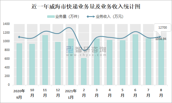2021年8月威海市快遞業(yè)務量與業(yè)務收入分別為1056.94萬件和12700萬元