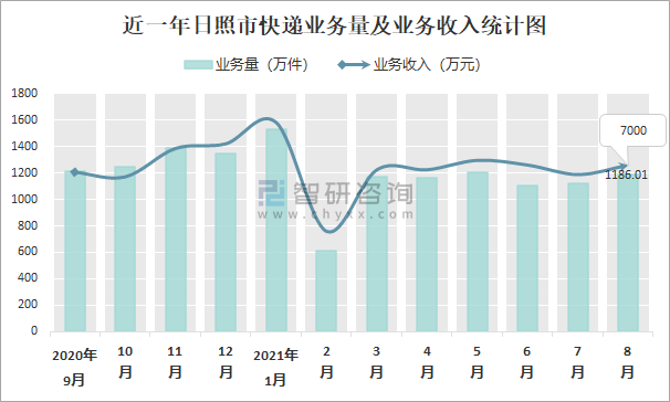 近一年日照市快遞業務量及業務收入統計圖
