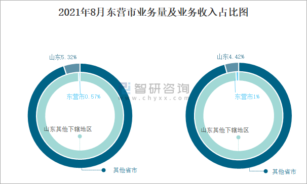 根據各省市郵政局數據可知:2021年8月東營市快遞業務量占山東快遞業務量的0.57%,山東快遞業務量占全國快遞業務量的5.32%;2021年8月東營市快遞業務收入占山東快遞業務收入的1%,山東快遞業務收入占全國快遞業務收入的4.42%。