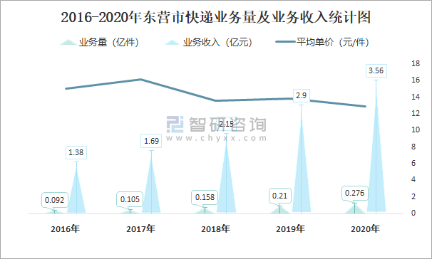 2016-2020年東營市快遞業務量及業務收入統計圖