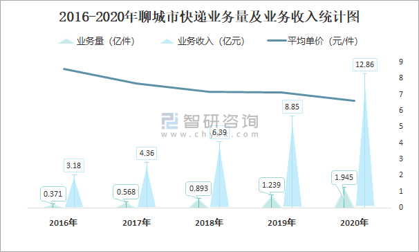 2016-2020年聊城市快遞業務量及業務收入統計圖
