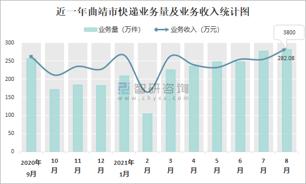 2021年8月曲靖市快遞業(yè)務(wù)量與業(yè)務(wù)收入分別為282.08萬(wàn)件和3800萬(wàn)元