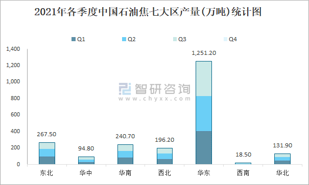 根據國家統計局數據顯示:2021年各季度中國石油焦主要集中在華東、東北、華南地區生產;2021年1-9月中國石油焦產量大區分布不均衡,其中華東地區產量最高,特別是山東省貢獻了最多產量;2021年1-9月中國石油焦各省市產量top1遙遙領先于其他前9名。
