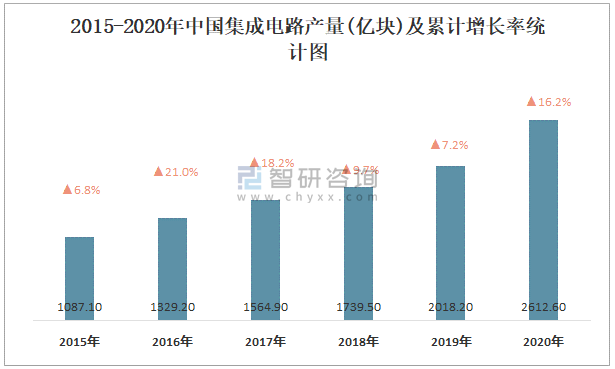 2015-2020年中國集成電路產量及累計增長率統計圖