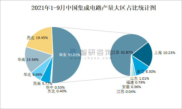 2021年1-9月中國集成電路產量大區占比統計圖