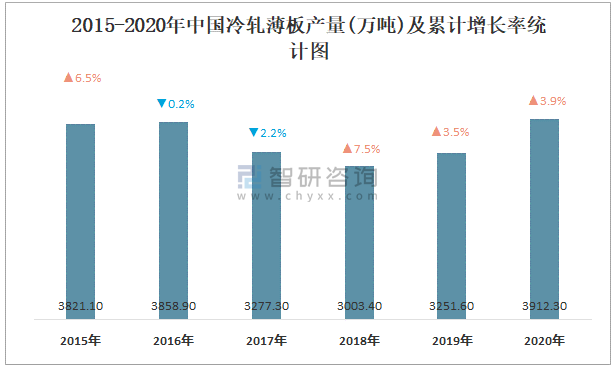 2015-2020年中國冷軋薄板產量及累計增長率統計圖