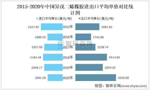2015-2020年中國異戊二烯橡膠進(jìn)出口平均單價(jià)對(duì)比統(tǒng)計(jì)圖