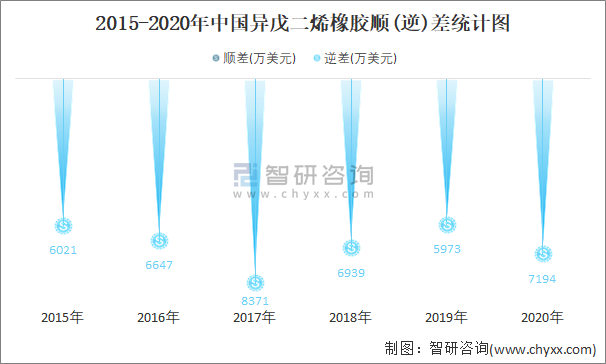 2015-2020年中國異戊二烯橡膠進(jìn)出口金額對(duì)比統(tǒng)計(jì)圖