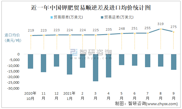 近一年中國鉀肥順逆差及進口均價統(tǒng)計圖