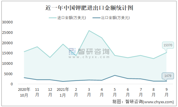 近一年中國鉀肥進出口金額統(tǒng)計圖