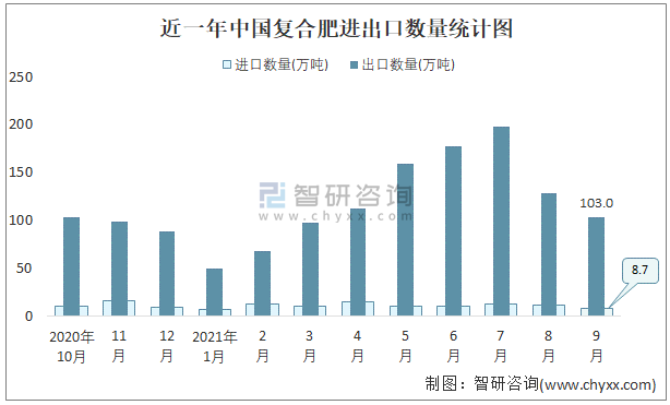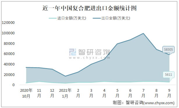 根據中國石油和化學工業聯合會數據顯示:2021年9月中國復合肥進口數量為8.7萬噸,出口數量為103萬噸;進口金額為5611萬美元,出口金額為58305萬美元;近一年中國復合肥出口總金額大于進口總金額,貿易順差為主,出口均價566美元/噸。