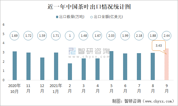 2021年9月中國茶葉出口數量和出口金額分別為3.43萬噸和2.44億美元