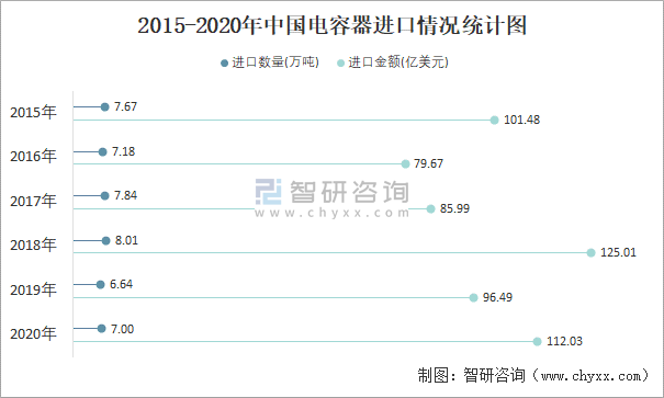 2015-2020年中國電容器進口情況統計圖