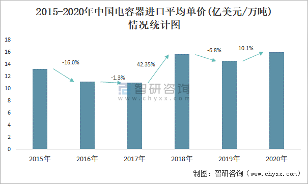 2015-2020年中國電容器進口平均單價(億美元/萬噸)情況統計圖