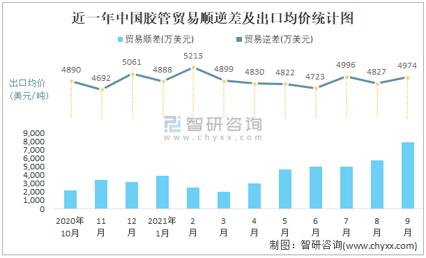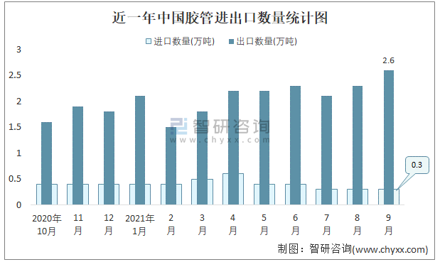 根據中國石油和化學工業聯合會數據顯示:2021年9月中國膠管進口數量為0.3萬噸,出口數量為2.6萬噸;進口金額為5023萬美元,出口金額為12933萬美元;近一年中國膠管出口總金額大于進口總金額,貿易順差為主,出口均價4974美元/噸。
